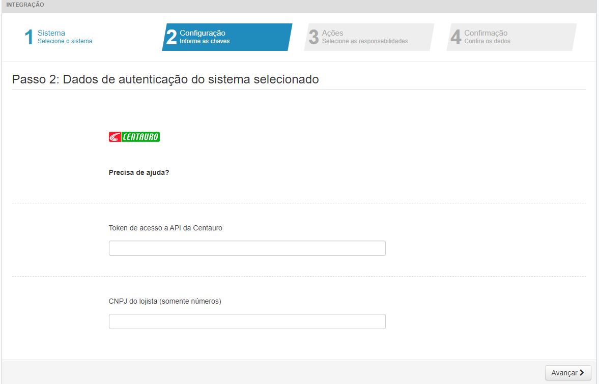 3) No passo 2, informe o token da Centauro e o CNPJ da sua conta e clique em Avançar