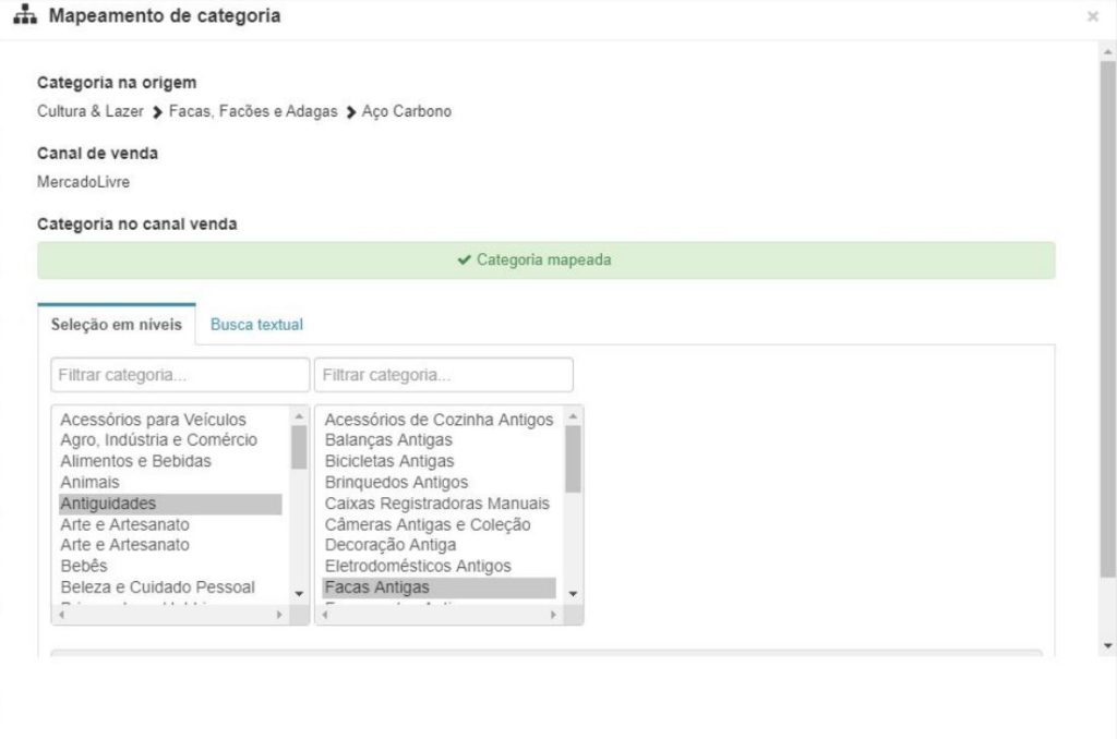 Para fazer o mapeamento de categorias, basta você acessar o módulo Produtos > Categorias. Neste módulo você poderá mapear as suas categorias de origem com as do Mercado Livre. Na HUB2B estará disponível toda a árvore de categorias do Mercado Livre, em níveis. Para facilitar esse mapeamento, você pode navegar na árvore de categorias para conhecer todas as opções disponíveis ou utilizar a busca textual para encontrar de forma mais rápida a categoria de destino.