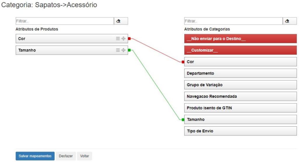 Além disso, a HUB2B permite que você faça o de-para de atributos da sua origem com os requeridos pelo Mercado Livre. Por exemplo, se você possui um atributo chamado “Cor da camiseta” e o Mercado Livre exige o atributo “Cor”, você pode mapeá-lo sem precisar alterar o nome “Cor da camiseta” para “Cor”.