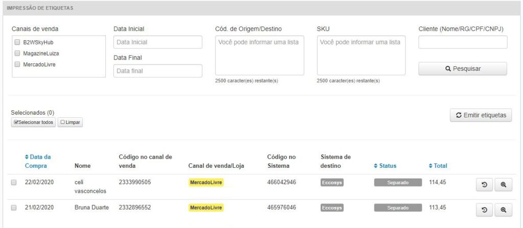 Caso você utilize o Mercado Envios ou a Coleta do Mercado Livre, você pode baixar e imprimir as etiquetas dos pedidos diretamente no painel da HUB2B, no menu Pedidos > Imprimir etiquetas.